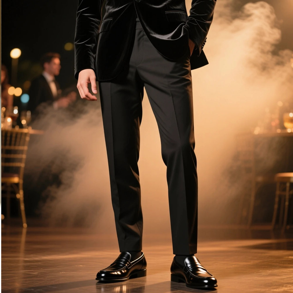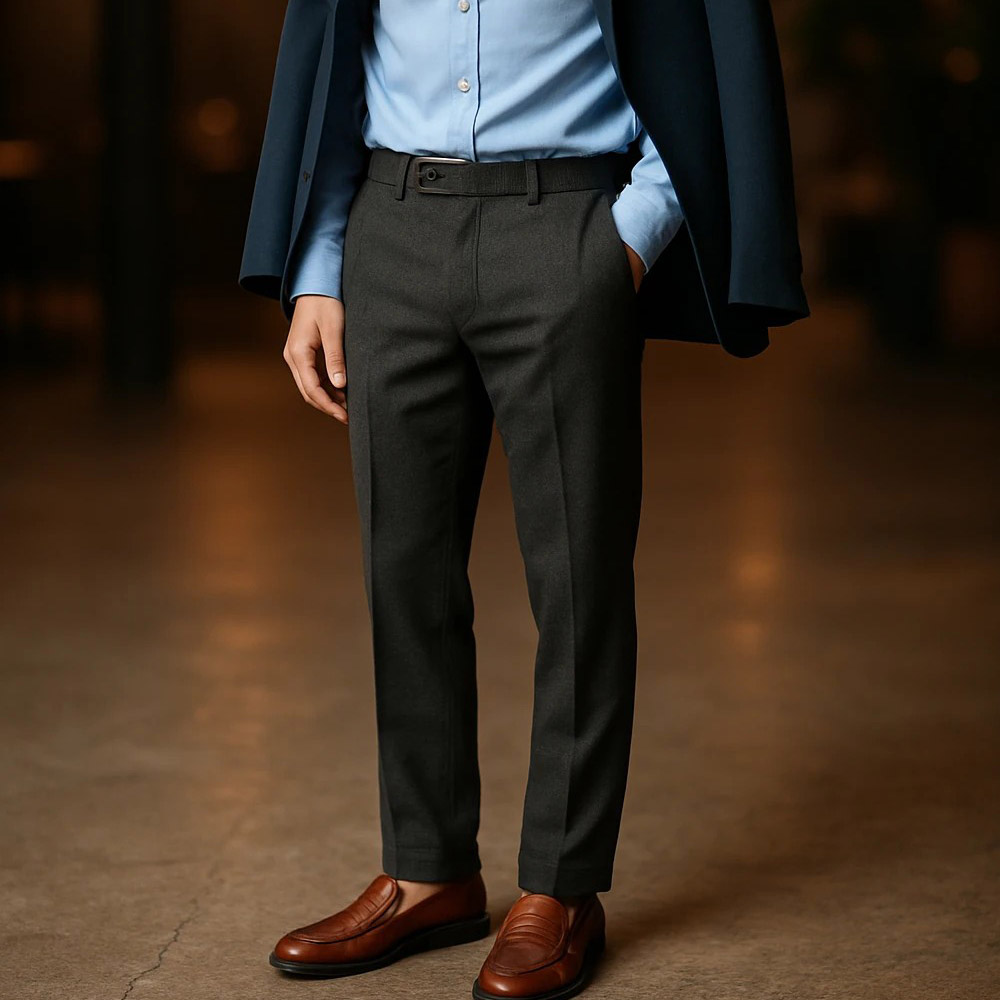 برای کتوشلوار رسمی، کفشهای چرمی کلاسیک همیشه انتخابی بدون ریسکاند. کتوشلوار مشکی با کفش مشکی یا زغالی ظاهر رسمی، و کتوشلوار خاکستری با کفش قهوهای یا مشکی، تعادل رنگی مطلوب ایجاد میکند.