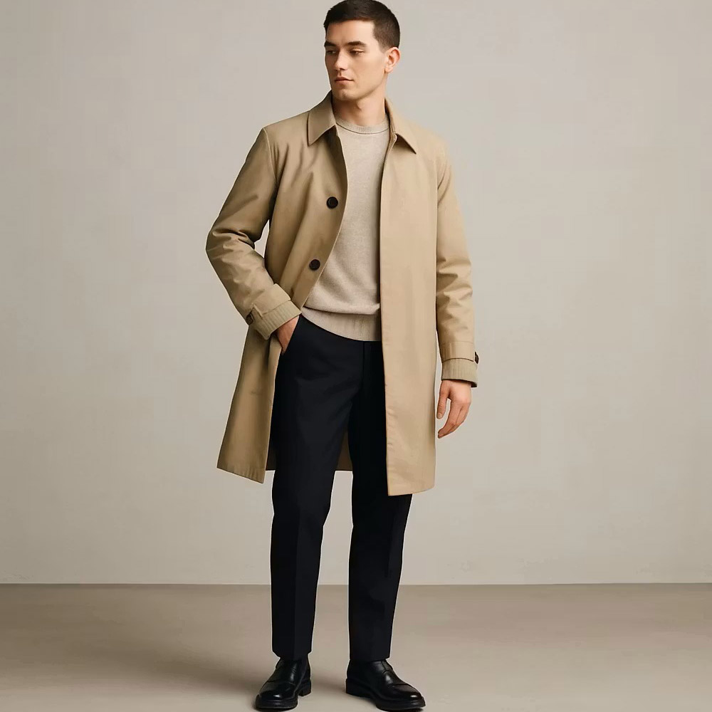 ترنچکت از دوره جنگ جهانی تا امروز در کمد مردان خوشپوش باقی مانده. به دلیل طراحی مینیمال و تناسب رنگهای طبیعی، با بیشتر لباسهای زمستانی هماهنگ میشود و ظاهری بینقص ایجاد میکند. ترنچ کت با رنگ خنثی بژ، در کنار پیراهن فلانل چهارخانه و شلوار سرمهای، ترکیبی بین مینیمالیسم مدرن و حالوهوای روستیک ایجاد میکند. این سبک برای کسانی که میخواهند کمی بافت و رنگ وارد پوشش زمستانی کنند، ایدهآل است. کفش لوفر یا کالج چرمی تیره، ظاهر را هم برای خیابان و هم برای کافه یا قرار دوستانه مناسب نگه میدارد.